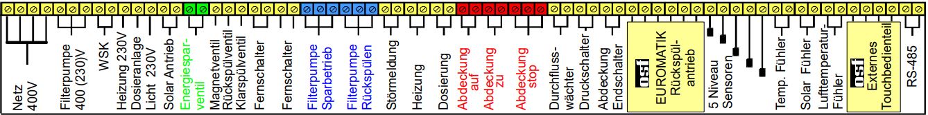 Mit der EUROMATIK2020 können Filterpumpen mit 230V oder 400V gesteuert werden, ebenso wie Pumpen mit Drehzahlregelung oder bis zu zwei Filterpumpen gleichzeitig. Ein integrierter Web-Server mit LAN-Anschluss ermöglicht die Anbindung ans Internet, die Gebäudeleittechnik oder ein Computernetzwerk. Bei einer Störung sendet das System automatisch E-Mails.