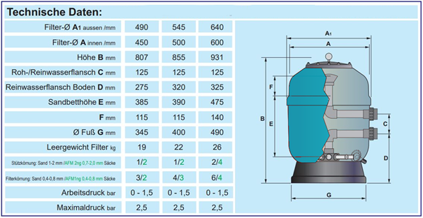 - Maximale Filtergeschwindigkeit: 50 m³/h/m²