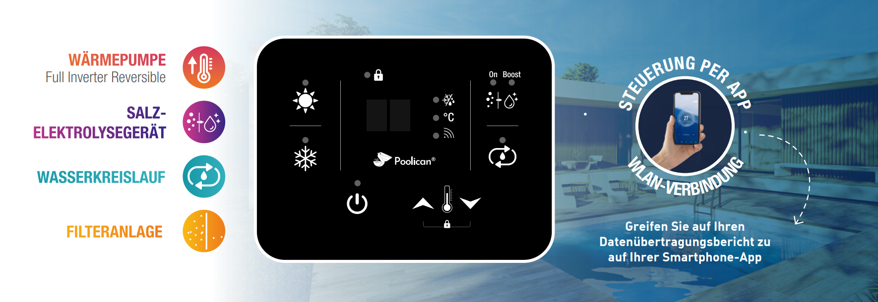 Über das intuitive Bedienfeld, oder natürlich per App, haben Sie Kontrolle über alle wichtigen Funktionen. Sie können die Wassertemperatur regulieren, einen Zeitplan erstellen, um so den Poolbetrieb automatisch zu steuern und Energie zu sparen. Gleichzeitig sorgt der Poolican für eine stetige und präzise Desinfektion. Genießen Sie sauberes, klares Wasser mit einer unvergleichlichen Bequemlichkeit.