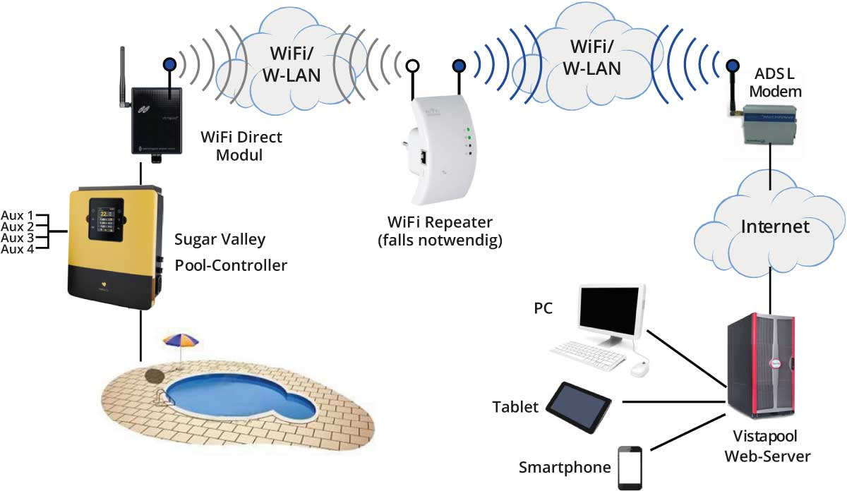 Mit dem Vistapool Control System können Sie Ihr Schwimmbad einfach und bequem von Ihrem PC, Tablet oder Smartphone aus steuern. Sollten Reichweitenprobleme auftreten, können Sie die Signalstärke durch einen Standard WLAN-Repeater erhöhen. Das Modul kann zudem mit Heizung, Pumpe und Beleuchtung verbunden werden, um diese Funktionen ebenfalls fernzusteuern. Außerdem lassen sich bis zu vier Geräte (Aux 1 bis Aux 4) über das System bedienen.